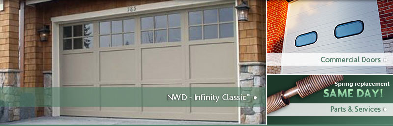 Infinity Classic is constructed of commercial grade extruded aluminum alloy stiles and rails. Mechanical fasteners that connect the stile and rails are extremely strong and visually undetectable. The aluminum panels that are used in the door are laminated and 50 times stronger than standard aluminum panels. The panels as well as the door frame are available with a polystyrene insulation. Windows are standard with clear annealed glass and a grid overlay which creates the window design. The Infinity Classic comes standard with a white polyester finish or it can be field painted if desired.